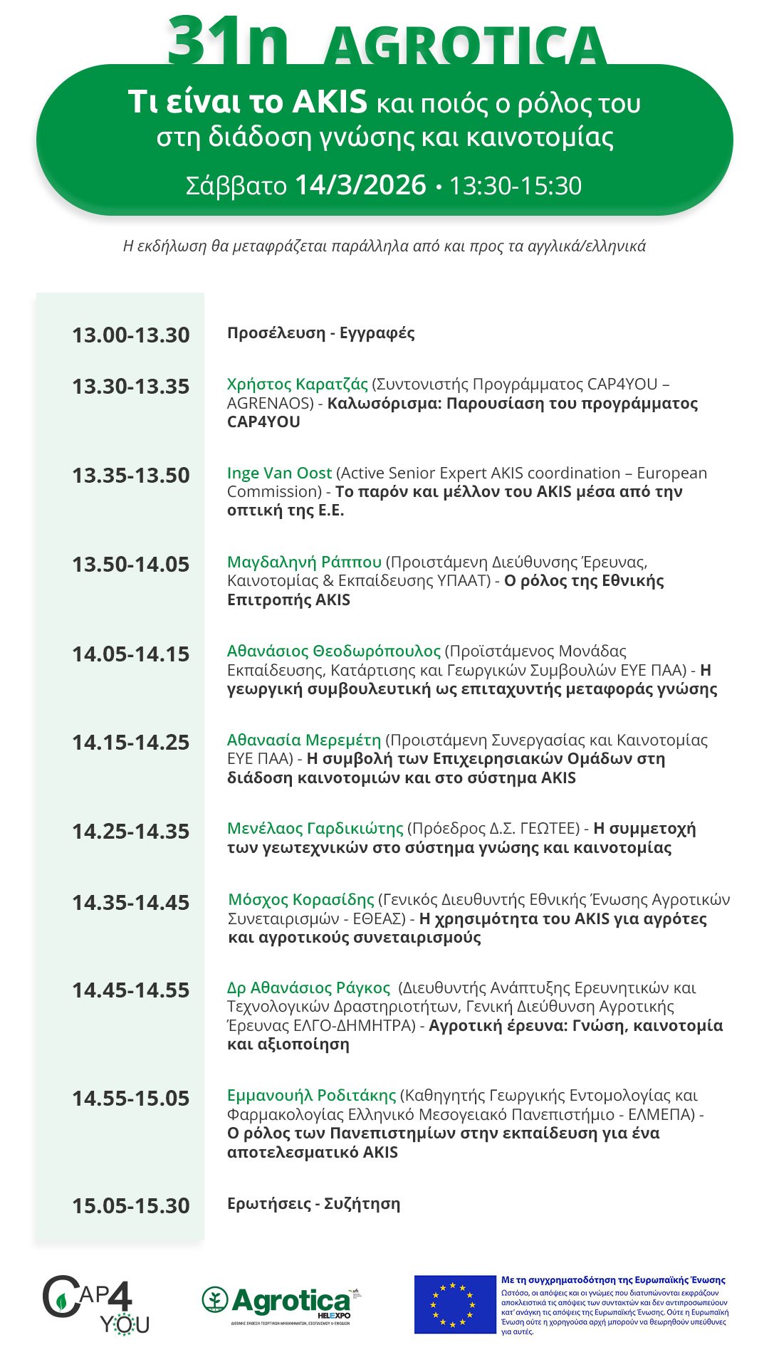 Ημερομηνία, ώρα και αίθουσα διεξαγωγής: AGROTICA – Σάββατο 14 Μαρτίου 2026, 13:30, στην αίθουσα C, Σ.Κ. “ΝΙΚΟΛΑΟΣ ΓΕΡΜΑΝΟΣ”.